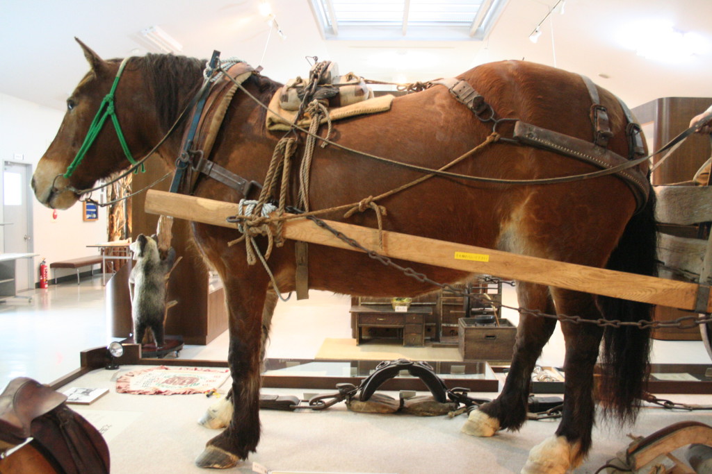 ペルシュロン種の剥製。・ペルシュロン種:フランスのペルシュ地方原産の大型馬で農耕、運搬馬として使用。(太田屯田開拓記念館)