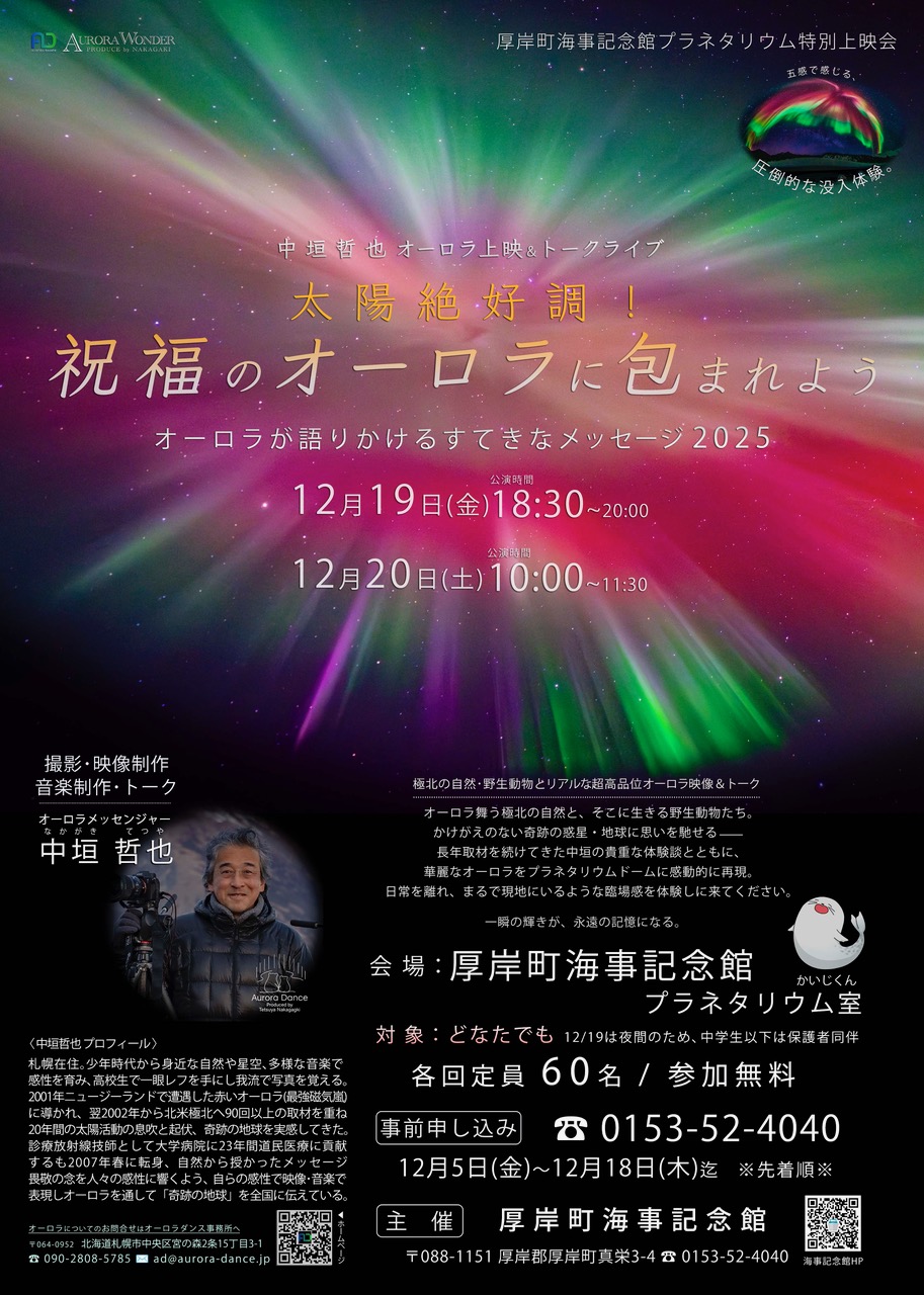 オーロラや極北の自然を通して『奇跡の地球』を伝える 活動を続けている中垣哲也氏による 貴重なオーロラ映像の投影と解説をお楽しみください。 |