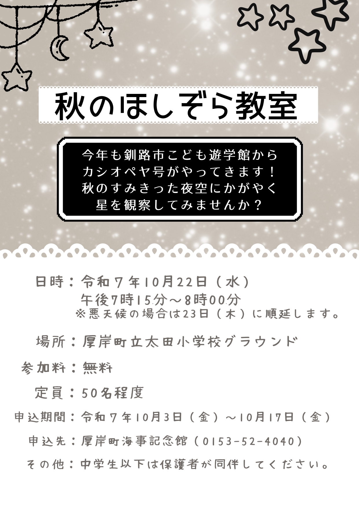 海事記念館では次の日程で【秋のほしぞら教室】を開催します。