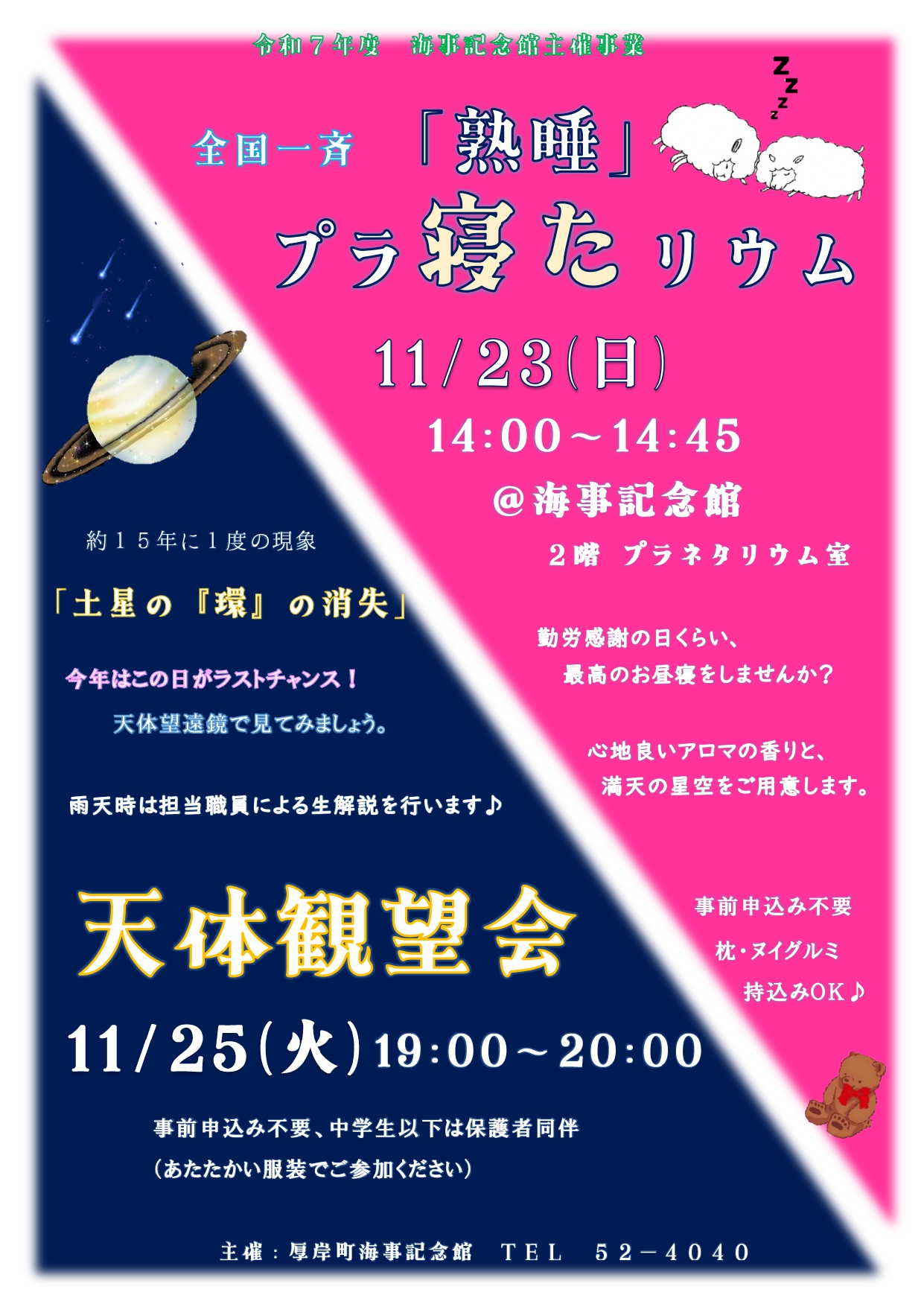 海事記念館では下記の日程で「全国一斉熟睡プラ寝たリウム」と「天体観望会」を開催します。