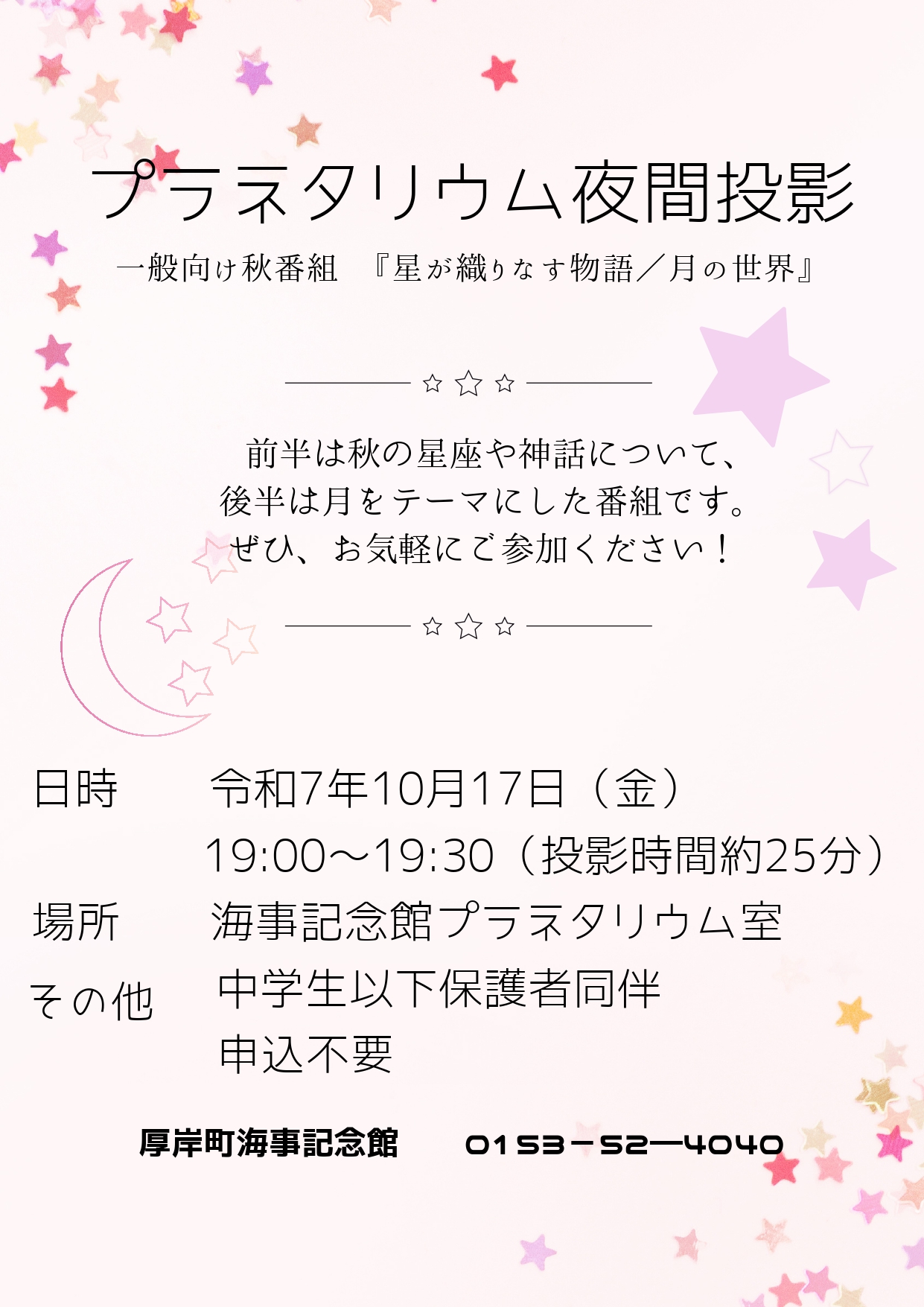 海事記念館では、次の日程でプラネタリウムの夜間投影を行います。