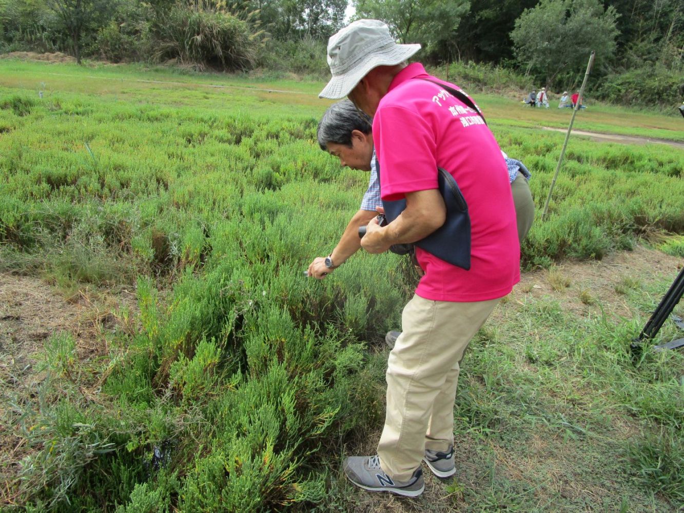 浅口市のアッケシソウは、平成15年(2003)に寄島町干拓地で初めて発見されました。平成16年(2004)には、アッケシソウは、当時の寄島町天然記念物に指定しました。同年に「寄島町アッケシソウを守る会」が結成され、アッケシソウの保護活動が開始されました。アッケシソウを守る会では、アッケシソウ自生地及び周辺の清掃及び環境整備に努めています。具体的には、年10回程度、雑草の草刈りや環境整備、アッケシソウの生態観察、分布調査や塩分濃度測定等の生育条件の記録、巡視等を実施されています。アッケシソウを守る会の約20年間に亘る保護活動で、アッケシソウ自生地の生息範囲は当初の約460平方メートルが約3,000平方メートルに拡大しています。この間には、異常気象の影響で発生した毒性ラン藻類によりアッケシソウが大量枯死したこと、日本初確認のヨリシマアッケシソウキバガの幼虫により、アッケシソウの茎内部が食害を受けた被害等が発生しています。