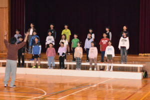 1・2年生は、「きつねのおきゃくさま」をモチーフに可愛らしく。3・4年生は、「ロールプレイングゲーム」風に勇ましく。5・6年生は、修学旅行先で「日本の歴史を巡るアトラクション」を体験する。といった演劇を披露しました。これまで学習してきたことをもとに、歌や器楽なども発表しました。全校合唱では、「あかいやねのいえ」を、5・6年生がハモりパートで頑張り、きれいな合唱となりました。
