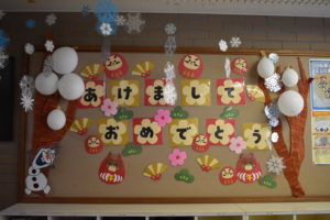 例年より短い20日間という冬休みを終え、3学期が始まりました。本校学級指導員さんが、四季折々の装飾を児童玄関に掲示してくれていましたが、始業式に登校した子どもたちを迎えてくれたのが、「あけましておめでとう」の装飾でした。