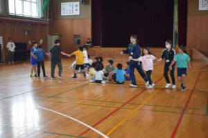 子どもたちが,ボールを持っている選手の後ろから離れないように機敏に後を追っていきます。離れないでくっついていく様子は,金魚をイメージしています。イメージを持ち,楽しそうに,ラグビーらしいよい動きをしている子どもたちでした。
