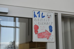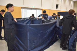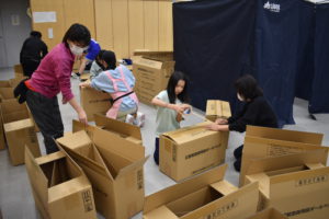 ダンボールベッドや仕切りテントを設置する訓練を行いました。参加者全員で協力し、手際よく設置することができました。また、7月30日に課題となったトイレの案内表示を低学年が担当し、分かりやすい案内板を作ることができました。避難所を設置するようなことが起こらないのが一番ですが、こうした訓練をしておくことも大切だと感じる1日でした。