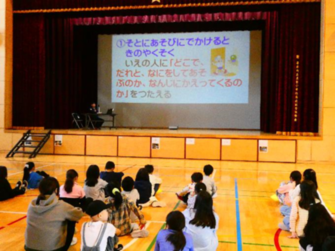 本日、警察の方を講師としてお招きし、体育館で防犯教室を行いました。2時間目に1〜3年生が不審者対策について、3時間目に4〜6年生がインターネットの適切な利用について学びました。児童からは、防犯やネットトラブルの未然防止についての知識を深めつつ、日常生活に生かそうとする様子が見られました。