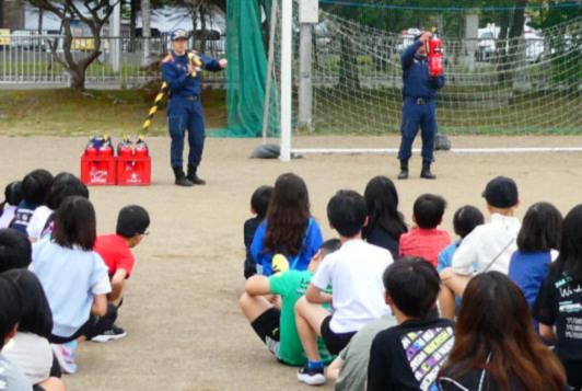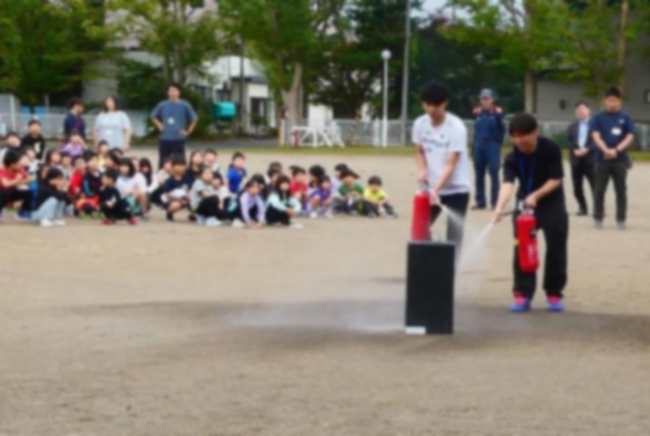 避難訓練は、釧路東部消防組合の消防士のみさなんにもご協力いただき、避難訓練の様子を見て講評をいただいています。また、今回は、消火器を活用した消火訓練を行い、先生方が実際に消火器を使い、模擬消火を行いました。